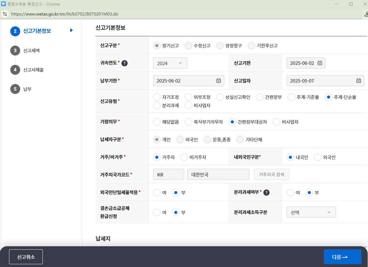 여기서 납부할 총 세액이 마이너스로 보이면 돌려받아야 하는 환급액이고 마이너스가 없다면 내가 도로 국가에 납부해야 하는 세금이므로 납부기간에 맞춰서 꼭 내야겠죠.