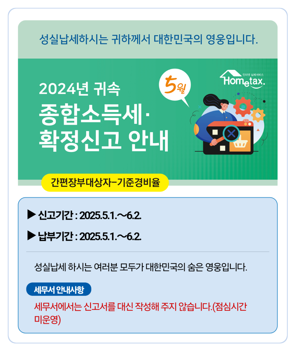 5월 종합소득세 신고기간은 5월 1일 ~ 6월 2일이며 납부기간도 동일합니다.